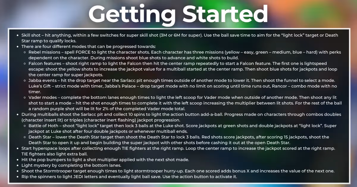 - Luke’s Gift: Strict timer-based mode. Shoot the orange shots to help the droids reach Jabba’s palace: droids target + Sarlacc pit drop target, Sarlacc pit, center ramp + right ramp, Luke VUK. Eventually the droids shot will be the only one lit, with the Sarlacc pit whirlpool changing which shot is lit (moves one to the right per spin). Make the flashing shot four times to light the Sarlacc pit to complete the mode.