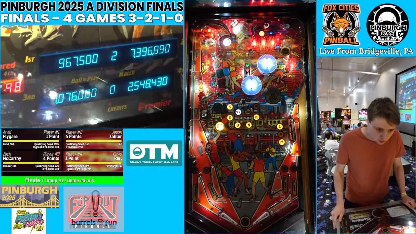 Thanks to the consistent streaming of Foxcitiespinball, qualifying and playoffs were broadcast live on Twitch, leading to loads of intense competition. Players endured 20 rounds of Match Play on Day 1 before being split into divisions, leading to another 20 rounds of Match Play on Day 2. Finals kicked off early on Day 3 and the field was cut down to the final four: Jason Zahler (#1 World Rank), Zach “Zmac” McCarthy (#2 World Rank), Arvid Flygare (#4 World Rank), and David Riel (#52 World Rank).