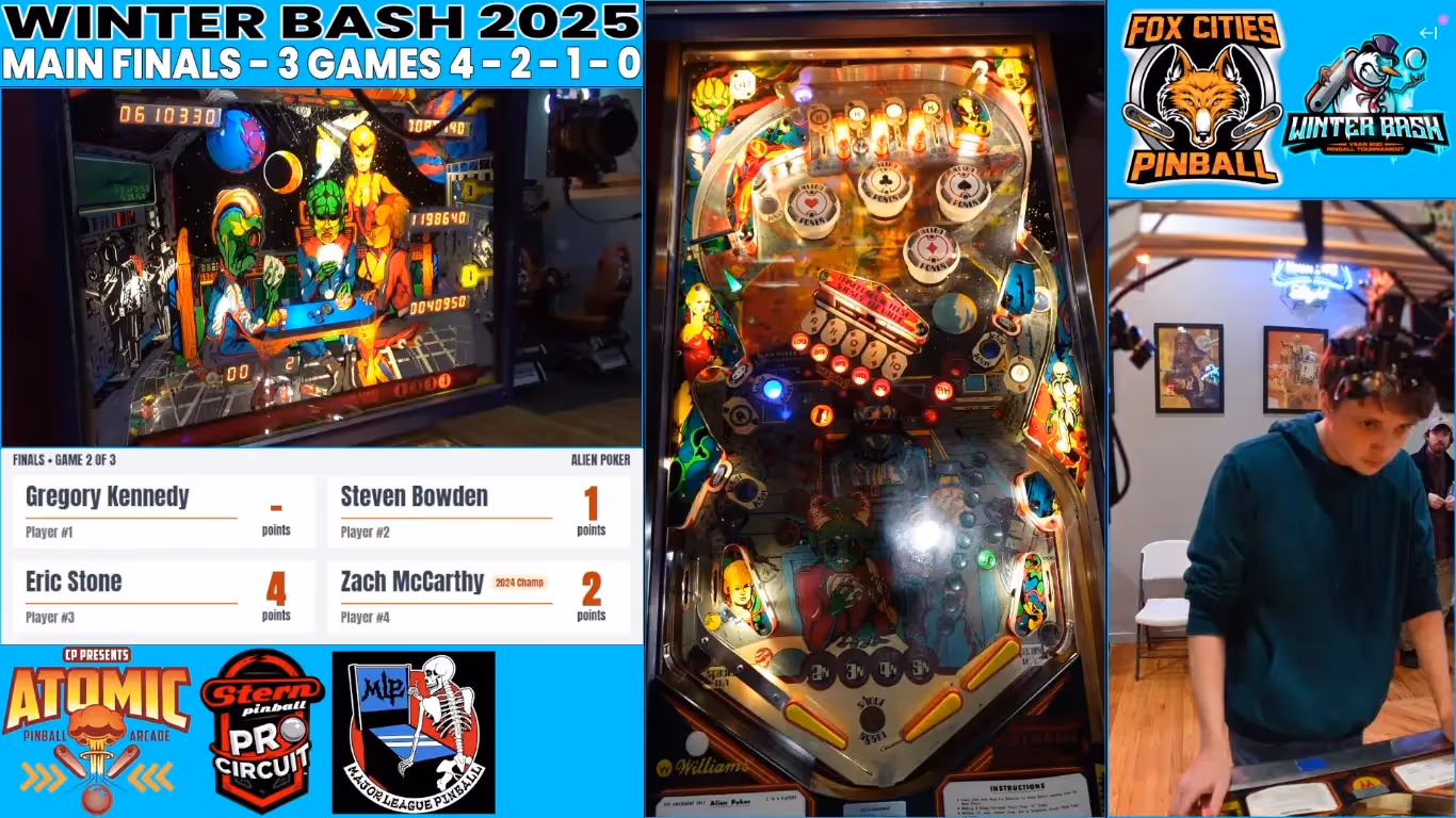 Bringing us over the finish line and capping off this year's Stern Pro Circuit was the 2025 Winter Bash, held at Atomic Pinball Arcade in Wood River, IL. A player-favorite competition, Winter Bash is a sociable, entertaining event, where the competitive pinball community gathers around for one last big tournament to wrap up the season. This year, over 115 players attended for a full day of group Match Play qualifying, for a total of 21 matches to play, with the top 40 qualifiers making it to A Division and the next 16 highest qualifiers occupying B Division. Just like with Pincinnati, the generous playoff cutline made for a more relaxed qualifying stage, but with some of the best players in the world competing for the last batch of circuit points, the playoffs were a ravenous affair.