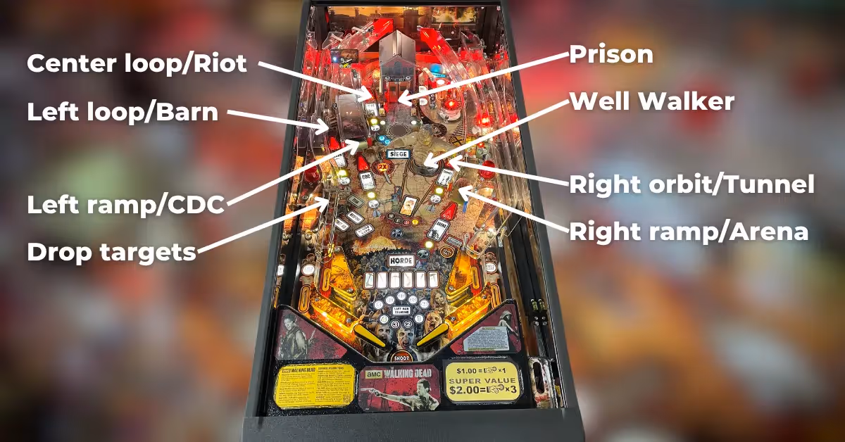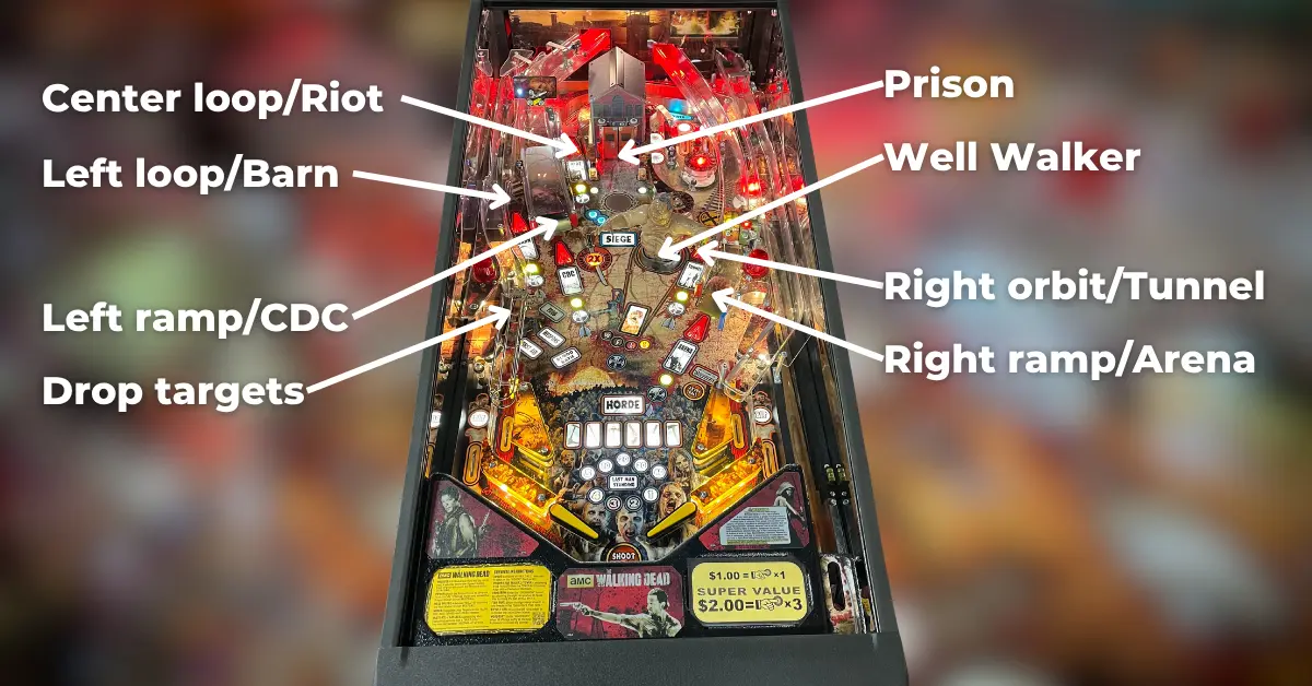 These are TWD's modes, and are lit by clearing the drop targets. Your first mode only requires you to complete the bank once; subsequent modes require you to complete it twice. Once modes are lit, shooting any lit shot will start a mode at that shot, with each shot housing a different mode (similar to Jaws or Baywatch). Modes can be lit and started during multiball, but cannot be stacked.