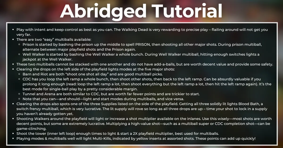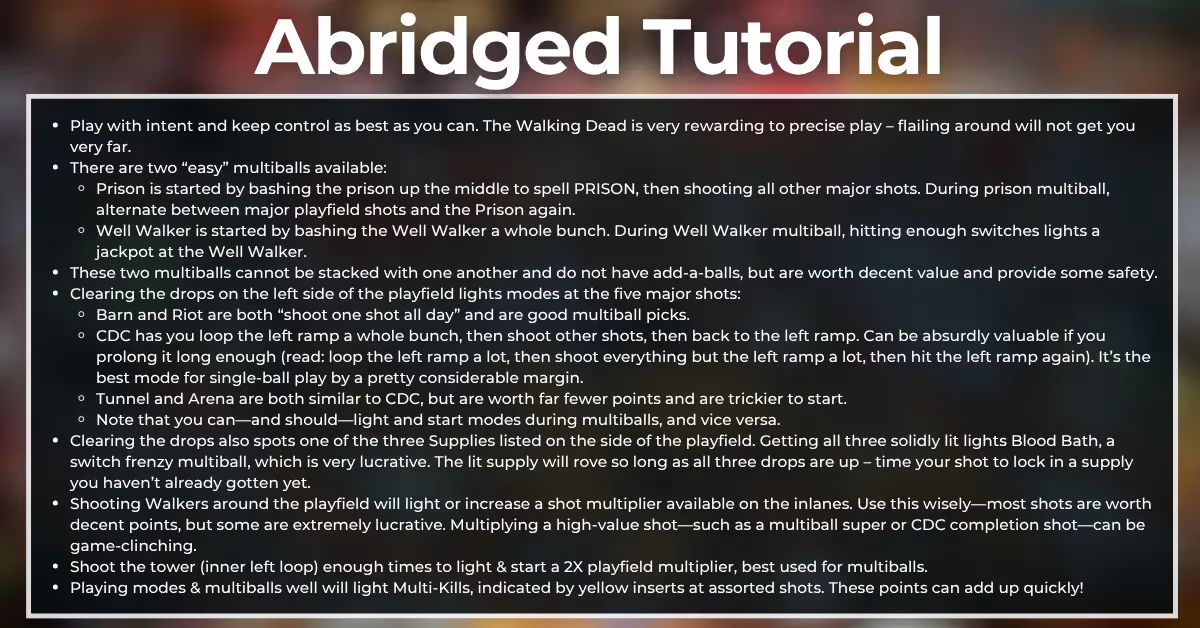- Shooting Walkers around the playfield will light or increase a shot multiplier available on the inlanes. Use this wisely—most shots are worth decent points, but some are extremely lucrative. Multiplying a high-value shot—such as a multiball super or CDC completion shot—can be game-clinching.