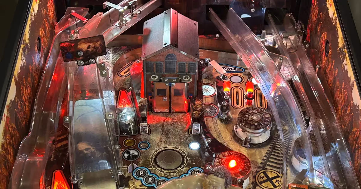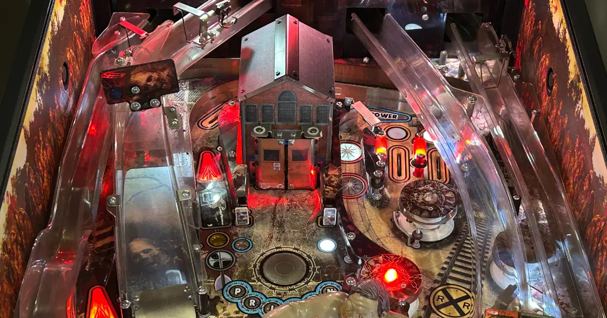 There are two prominent toys — the Well Walker in the center-right of the playfield and the Prison straight up the middle. Both advance you towards multiballs, and as you may have guessed, are both absurdly dangerous. The prison, in particular, is guarded by an electromagnet that tends to just throw balls straight down the middle, so proceed with caution when aiming for it. The prison doors will occasionally open, revealing a zombie's face. This zombie face is effectively just an arrow insert—it works the same as the doors; it’s just indicating you should aim at the prison. However, the face frequently fails to register hits. As such, most competitive TWDs will just disable the door-opening mech so that all prison shots are to the doors, which are much more responsive. Honestly, this barely warrants explaining, but if you're wondering why the doors are or aren't opening, there you go.