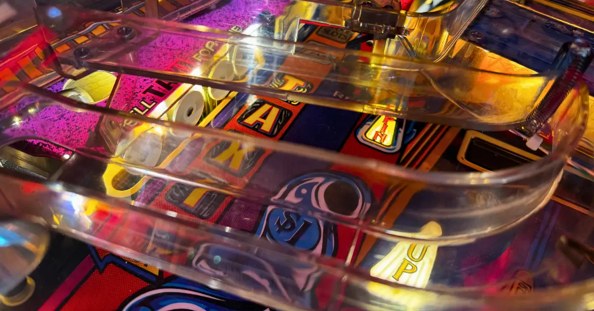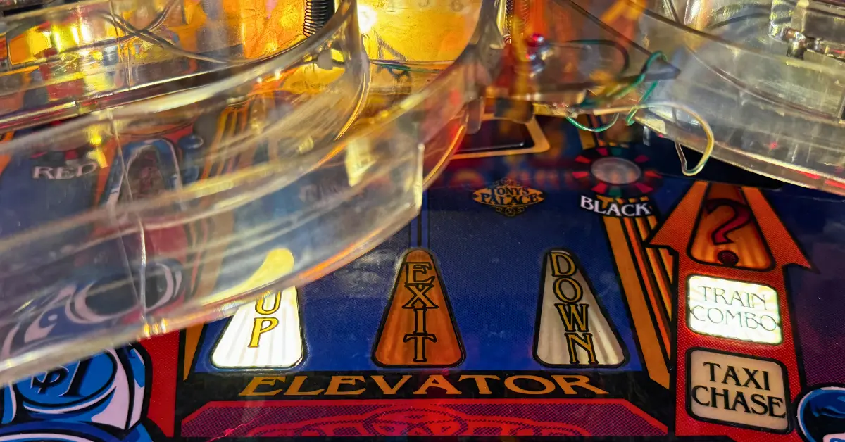 The right side of the playfield is occupied by three shots. The game’s only other ramp is the train ramp, which feeds the left flipper for repeated shots and attempts at train combos but can also raise to reveal the opposite side of the left orbit if taxi chase is lit and during most multiball modes. The spinner shot feeds a post under the roulette and sends the ball to the right flipper, ideal for ski passing back to the left flipper; hitting this shot once will light the roulette if it isn’t already lit. The sewer shot is on the far right of the playfield and sends balls to the right flipper; it contains a fourth ball that releases when roof multiball begins and will keep the ball locked there the next time it is hit during normal play.