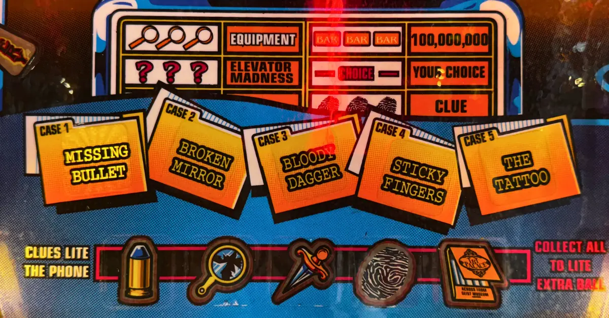 To interrogate suspects, collect a clue and then shoot the phone. Clues are awarded every time TAXI is spelled by shooting either the TAXI targets or shooting the lit orbits when “taxi chase” is lit from the inlanes to spot letters. The player cannot stack multiple interrogations, though if who dunnit is lit, collecting another clue will light the phone for interrogation again. Collecting all five clues in a single case will light extra ball at the phone, then award 50M for each subsequent clue collected until the case ends. Evidence given from the elevator floors or map award can help pin down suspects easier than interrogations, and awards 25M for each evidence piece found.
