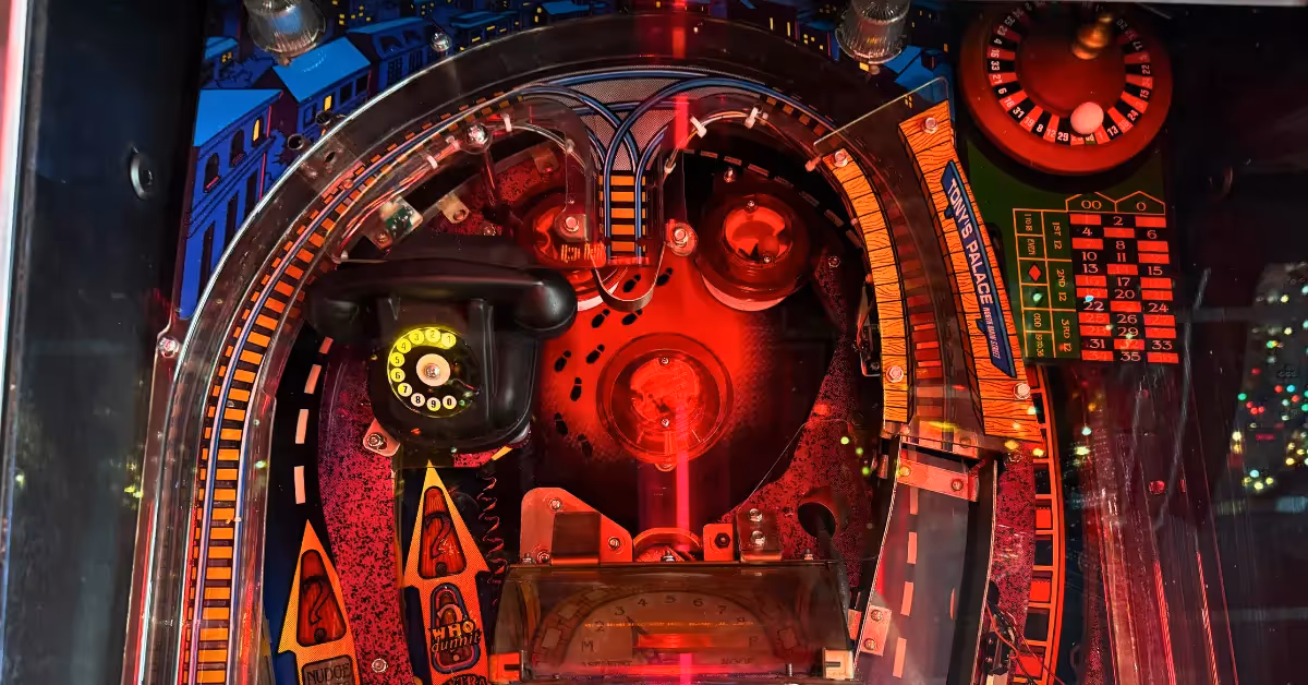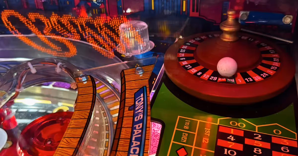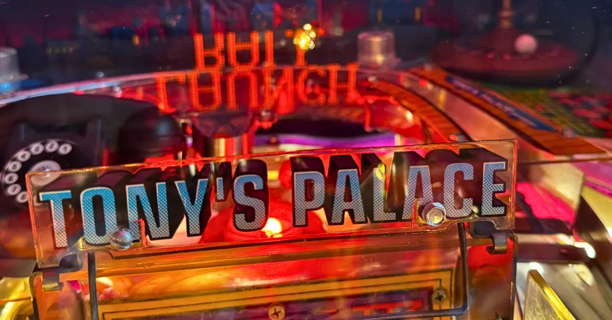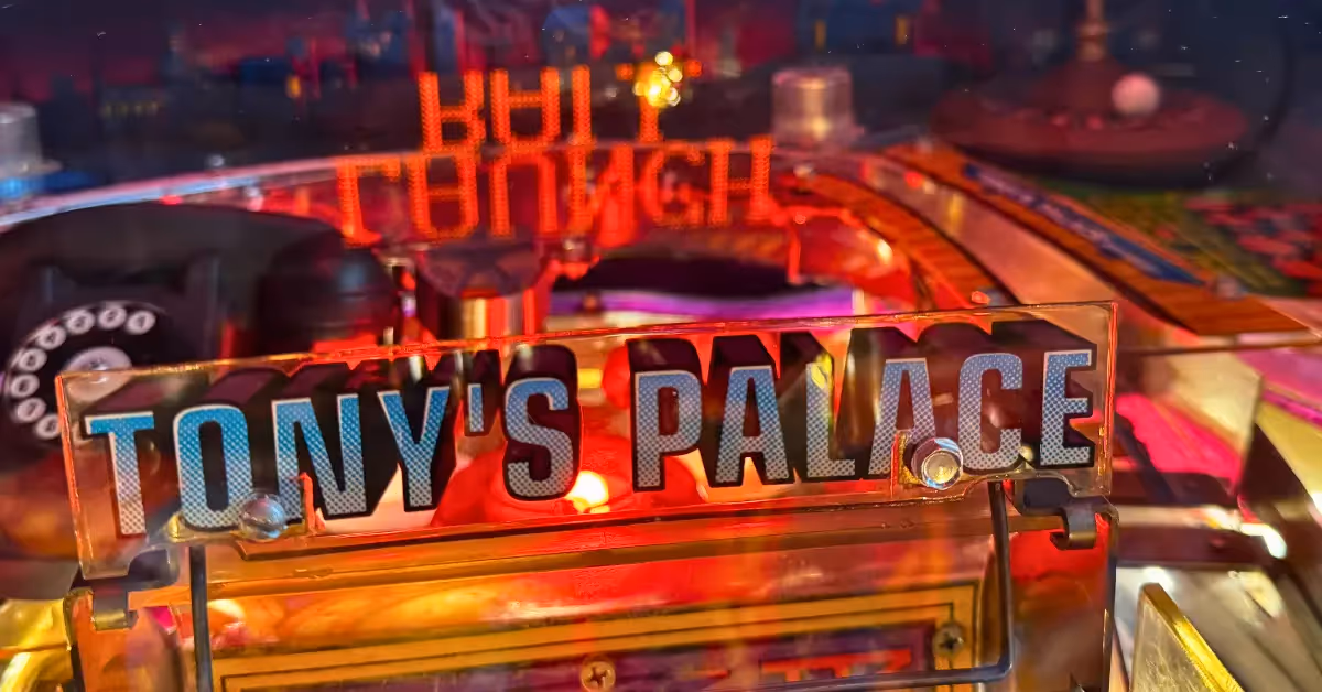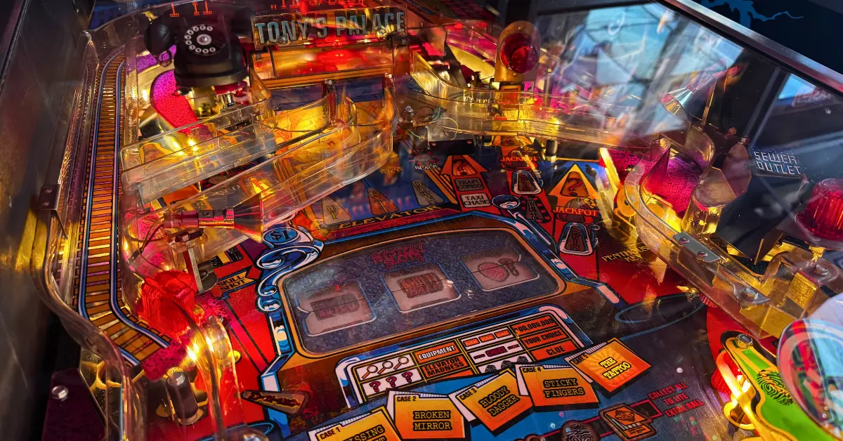 Tony’s Palace is a casino whose owner, Tony, and bouncer, Bruno (Tex), are tangled in a web of deceit alongside its other employees. As Nick Spade, the player must unravel “WHO dunnit” by interrogating the suspects, all while exploring the casino for evidence and gambling their winnings away. This 1995 pinball machine more heavily emphasizes story and progression than its contemporaries.