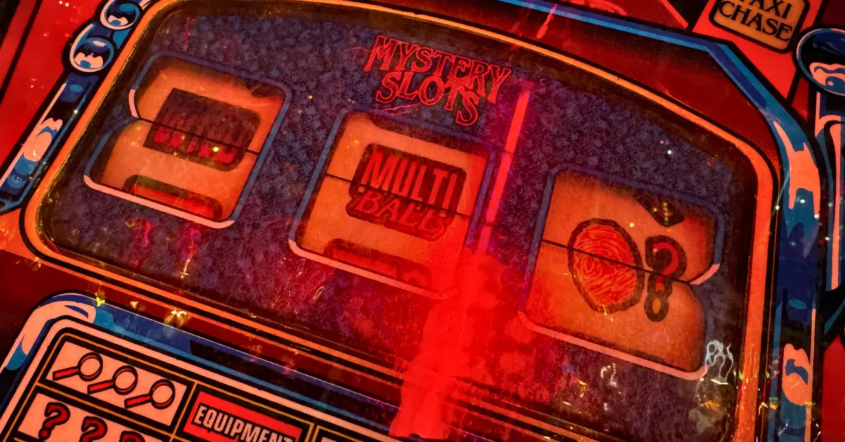 Spin the mystery slots by shooting any shot lit for “spin”, or draining down an outlane with Free Spin lit. The “spin” shots start the game lit, and can be relit by accessing the main floor on the elevator or completing the 3-bank target in front of the elevator. Spins can only be relit at shots that don’t currently have anything else lit: for instance, if interrogation or who dunnit is lit at the phone, it won’t light for spin.