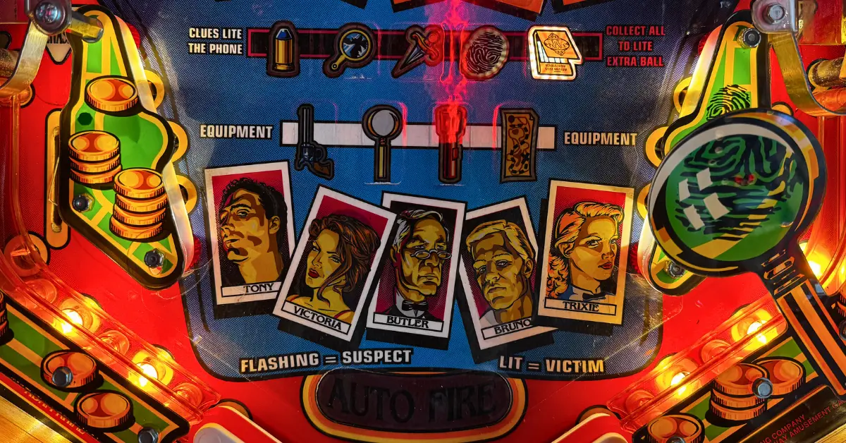 1995 marked an interesting year for pinball development; along with SEGA making marked improvements in their pinball machines, Williams / Bally opted to put out the widest variety of different pinball machines they had put out in a while, all with much higher scoring than previous tables. While Attack from Mars and Johnny Mnemonic are two incredibly fast and flowing tables from this year, tables like Jack*Bot and today’s tutorial subject, WHO dunnit, are more stop-and-go but compensate for their slow nature with high scoring and unique themes. Though WHO dunnit was the brainchild of Barry Oursler, the game’s design and software were handled by Dwight Sullivan, who opted to use this machine to introduce some new ideas to pinball progression that are still being used today, including equipment that gives perks throughout the game and a story that continues across every play of the machine.