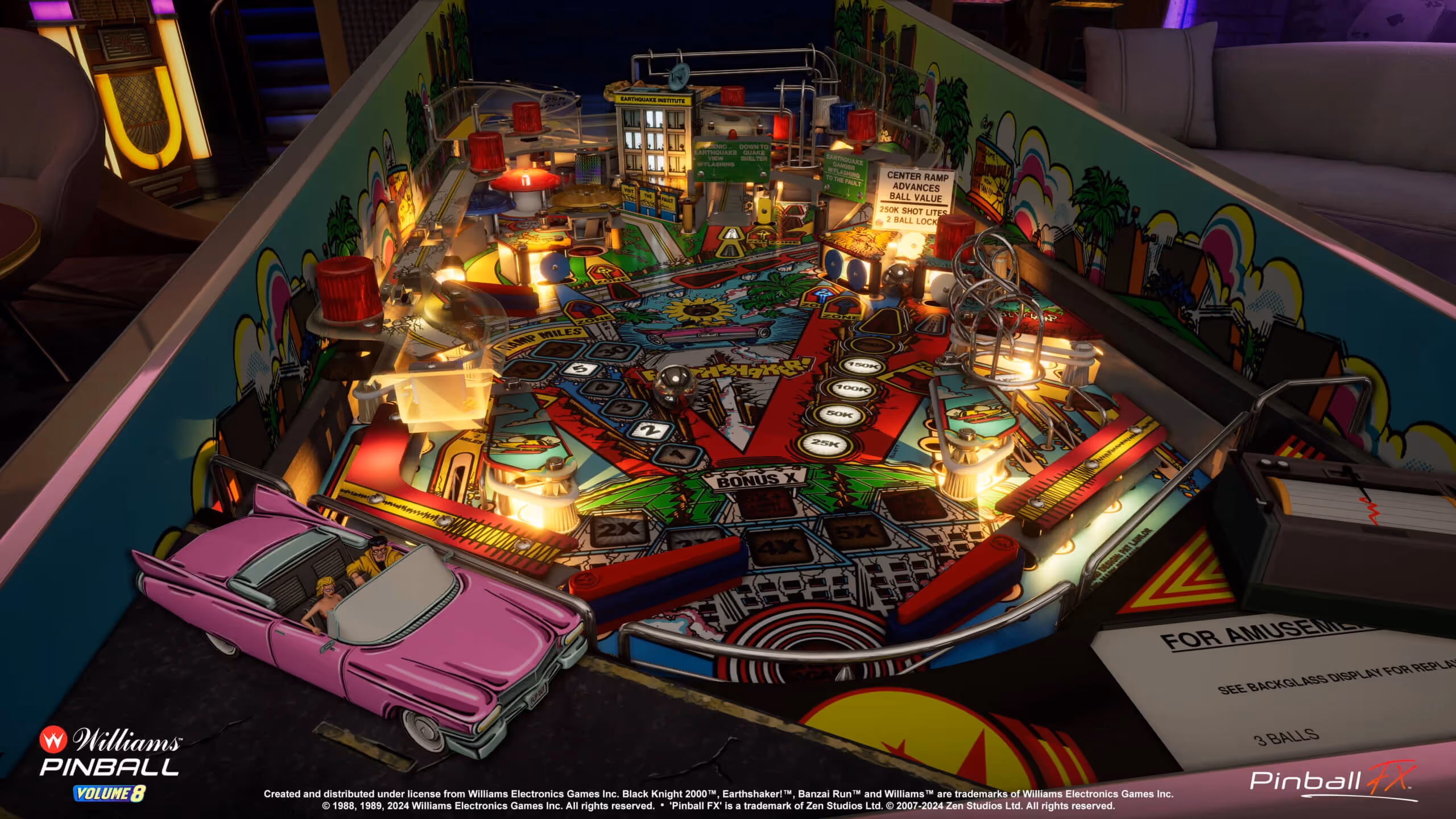 Earthshaker! is themed after the earthquakes that are considered a rite of passage for San Francisco residents. The player collects zones on the earthquake institute building then must take shelter by shooting either the side ramp or lock sinkhole. Multiball begins once two balls are locked and the player can score the jackpot by shooting the center ramp to light it, then the side ramp to collect it. All the while, the player’s miles are increased with center ramp shots, with massive payoffs at the end of the road after collecting 99 miles – 200k points per ramp shot!